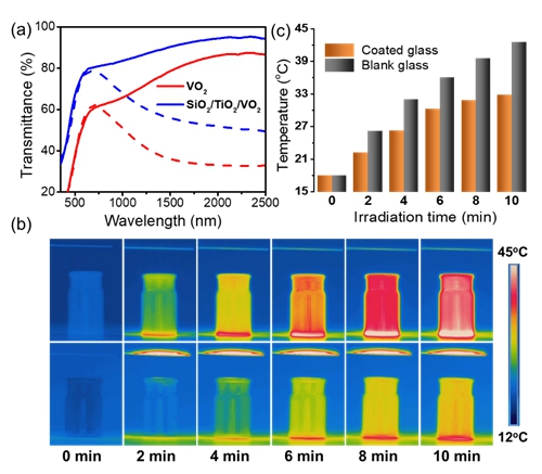(a) VO2和SiO2/TiO2/VO2 TLNHs涂层的高低温透光率曲线,(b)/(c) TLNHs涂层的节能效果测试图