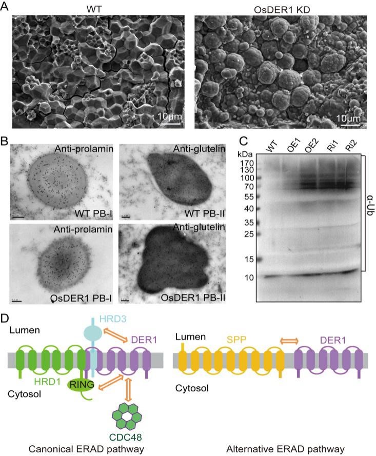 中国科学院植物研究所曲乐庆研究组在前期研究工作中发现,胚乳特异性抑制小G蛋白SAR1的表达,会导致分泌蛋白滞留在内质网中,导致水稻种子产生内质网胁迫。在此基础上,研究人员分离纯化了发生内质网胁迫的水稻种子的内质网,通过定量蛋白质组学分析,鉴定到一个内质网胁迫应答因子OsDER1。研究人员发现,OsDER1表达受ER胁迫诱导,过量表达或者抑制表达OsDER1会激活未折叠蛋白响应,使水稻对内质网胁迫更加敏感,泛素化蛋白的水平显著提高;抑制表达OsDER1转基因水稻种子呈现粉质、皱缩表型,淀粉粒和蛋白体I形态发生改变。进一步研究表明,OsDER1与经典的ERAD途径核心组分OsHRD1、OsHRD3以及OsCDC48均存在相互作用。研究人员还发现,OsDER1还与信号肽肽酶OsSPP相互作用。近期的一些研究表明,在酵母和哺乳动物系统中SPP和DER1能够形成一条新的ERAD途径,而OsDER1与OsSPP相互作用结果暗示这条ERAD途径在植物中也保守。