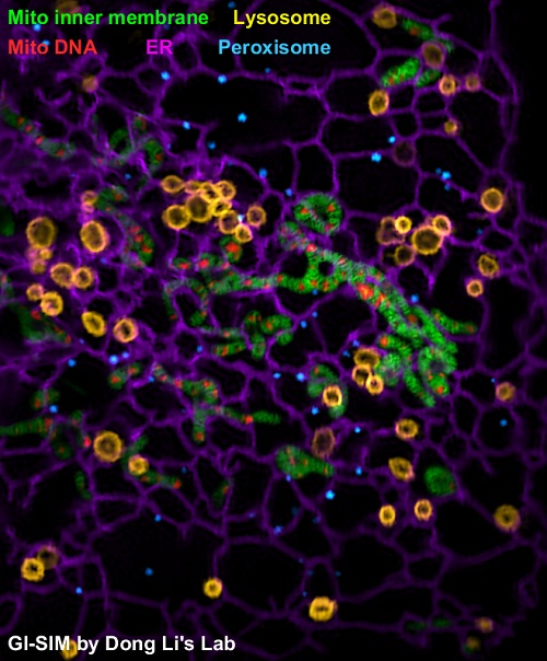 GI-SIM可对活细胞以97纳米分辨率、266幅每秒的成像速度连续成像近万幅超分辨图像。与李栋先前开发的全内反射结构光照明超分辨成像技术(TIRF-SIM; Li et al., Science, 2015)相比,GI-SIM的成像深度以及所产生的信号量都提高了10倍;与传统共聚焦或转盘共聚焦显微镜相比,GI-SIM可提供2倍更高的空间分辨率以及10倍更快的成像速度;与其它超分辨成像技术相比,在细胞尺寸的视场范围下,GI-SIM可提供~10倍更快的成像速度,以及10-100倍更长的成像时程。GI-SIM实现了对细胞内多种细胞器动态的最优化二维超分辨成像,这使得研究人员发现了多种细胞器互作新行为。例如: