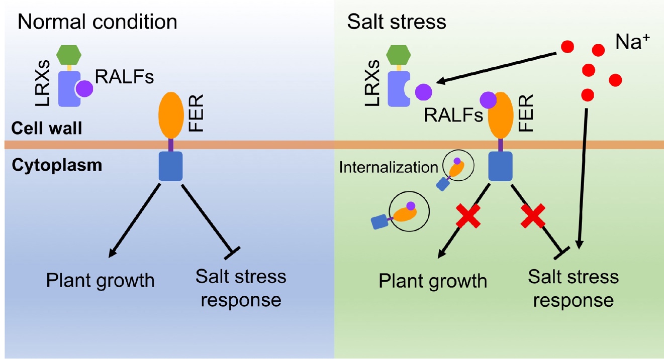细胞壁中存在一类LRX蛋白。这类蛋白包含一个能够结合细胞壁多聚糖的extensin结构域以及一个能够与其它蛋白相互作用的LRR结构域。在该项研究中,科研人员发现当把LRX蛋白家族中的LRX3、LRX4和LRX5三个基因同时突变后,植株表现出生长矮小且对盐胁迫非常敏感的表型。通过质谱以及免疫共沉淀的方法发现LRX蛋白通过其LRR结构域与RALF22和RALF23等多肽相互作用。CrRLK1L蛋白家族成员中的FER蛋白是RALF多肽的受体。该研究发现FER能够与RALF22和RALF23直接相互作用。表型分析显示FER突变体以及RALF22和RALF23过量表达的转基因植株都表现出生长矮小和对盐胁迫敏感的表型。据此,该论文推断LRX蛋白、RALF多肽和FER蛋白形成一个元件来感受细胞壁的完整性,从而调控植物生长和耐盐性。研究还表明在盐胁迫处理后,S1P蛋白酶能将RALF22多肽前体切割成成熟的RALF22多肽,而成熟的RALF22多肽能够诱导FER蛋白的内吞。这些结果揭示了盐胁迫下RALF多肽如何调控FER蛋白的活性。这项科研成果将会为培育抗逆高产作物提供新的方向和思路。