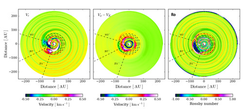 图1 由罗斯贝波不稳定性产生的反气旋旋涡在原行星盘中产生了大约0.3 km/s 和0.2 km/s的径向和横向的速度扰动,而该扰动可为ALMA 的0.1 km/s的速度分辨率所分辨。