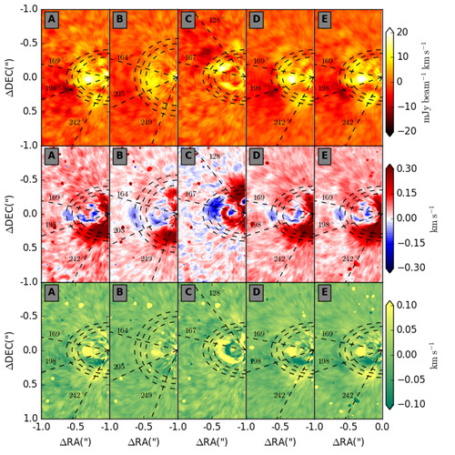 在该项研究中,科研人员通过大量的流体动力学模拟,尘埃辐射转移计算,ALMA数据图像处理,生成模拟的12CO气体分子的发射谱线,计算12CO分子的径向速度分布,确认了旋涡在原行星盘反气旋速度场的痕迹(图1-2)。这项研究对未来ALMA寻找原行星盘中的旋涡结构具有重要意义。