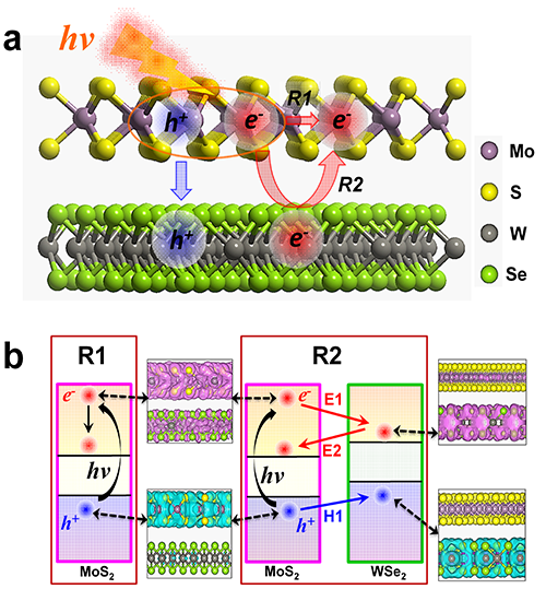 以二硫化钼(MoS2)为代表的过渡族金属硫族化合物,因其合适的能带结构和光学性质,在光电子器件等用途中有着很好的应用前景。单层过渡金属硫化物堆叠而成的二维异质结,在新型光电子和光伏器件领域具有十分广泛的使用潜力。最近的超快激光实验发现,二维异质结中激发的电子-空穴对的分离过程能够在50 fs的超快时间尺度发生,为极大提高光电器件的响应速度提供了可能。然而,对于决定器件工作性能的微观机理,比如超快电子/空穴动力学、层间能量转移以及层间热激子的形成等,因缺乏深入的研究而大都处于空白状态。