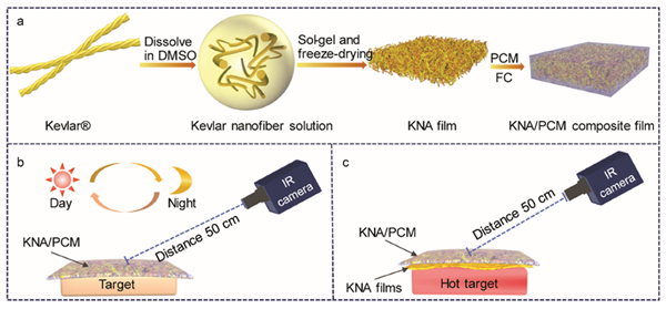 中国科学院苏州纳米技术与纳米仿生研究所研究员张学同领导的气凝胶团队制备了一种具有高孔隙率(98%)和高比表面积(365.99 m2/g)的柔性气凝胶薄膜,通过溶解杜邦TM的Kevlar获得纳米纤维溶胶,再经刮刀涂布、溶胶-凝胶及后续的冷冻干燥过程获得Kevlar气凝胶薄膜。该气凝胶具有优异的隔热性能,室温环境下,热导率约为0.036 W/m·K,200μm厚的气凝胶薄膜覆盖在300°C的热源上,气凝胶表面温度仅为220°C,温差达到了80°C。与相变材料聚乙二醇复合并进行疏水化处理,制备出气凝胶/相变复合薄膜,该相变复合薄膜:(1)相变焓高达179.1 J/g;(2)红外发射率与多数环境背景匹配;(3)在3μm-15 μm红外波段具有超低红外透过率。在室外环境(如光照)下,用该复合薄膜覆盖无发热物体,可实现红外隐身。对持续发热物体(比如发动机),提出了气凝胶隔热层与相变复合薄膜叠加的组合结构:Kevlar气凝胶薄膜具有优异的隔热性能,根据目标与环境之间的温度差异,选择合适层数或者厚度的气凝胶层,可将温度降低至与环境温度匹配;相变复合薄膜具有低红外透过率,高温目标发射的红外光无法透过。因而覆盖这种组合结构的高温目标在红外照片中也能实现红外隐身。
