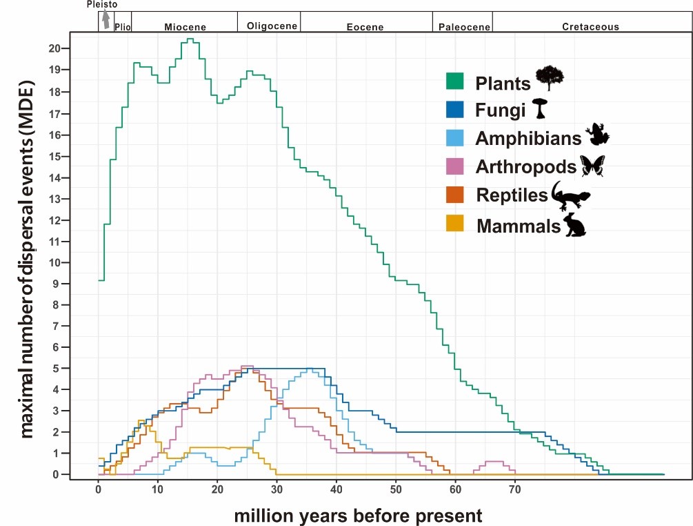 该研究进一步揭示了欧亚大陆和北美大陆之间不同生物类群的扩散事件具有不同的高峰期。由于在古新世和始新世早期,混合落叶阔叶林和常绿亚热带森林的北方热带植物区系带广泛分布于北半球,白令陆桥在这段时间是主要的扩散通道,此时适应温暖环境的生物类群包括两栖动物、爬行动物和昆虫在这期间的扩散事件中占主导地位,两栖动物的扩散非常显著。昆虫、爬行动物、两栖动物和真菌在两大陆间的生物交换发生的时间(~40-25 Ma)比植物和哺乳动物更早(~25-8 Ma)。