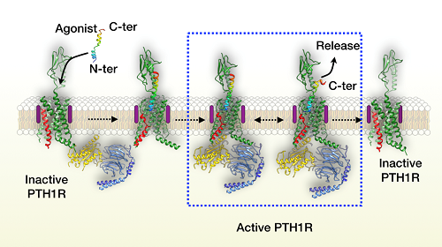 甲状旁腺激素(Parathyroid hormone, PTH)是一种典型的内分泌激素,80多年前被确定为调节血钙水平的关键因子,对维持机体离子稳态和骨骼健全至关重要。PTH与在骨细胞和肾脏细胞中高表达的B类G蛋白偶联受体(G protein-coupled receptor, GPCR)家族成员PTH1R特异性结合后激活下游信号通路,进而调节体内的钙磷代谢。因此,PTH1R是公认的骨质疏松症治疗靶点,目前已有相关药物(PTH类似物如特立帕肽Teriparatide acetate)应用于临床。