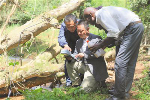 在肯尼亚的阿伯戴尔地区,中肯两国研究人员在进行水质监测(人民日报记者 吕强摄)