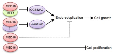 中国科学院遗传与发育生物学研究所研究员李云海研究组在筛选da1-1增强子中发现eod9-1突变体(enhancer of da1-1)。基因克隆发现,EOD9编码中介复合体亚基MED16蛋白。eod9-1与med16-2 (MED16 T-DNA插入突变体)具有大叶、大花和大花序的表型。med16-2叶片与花瓣细胞显著增大,叶片与花瓣细胞的细胞核内DNA倍性显著增加,表明MED16为核内复制、细胞大小和器官大小的负调控因子。MED16也负调控于细胞分裂。MED16与转录抑制因子DEL1 (DP-E2F-like1/E2Fe)直接互作,DEL1可以介导CCS52A2 (细胞周期后期促进复合体APC/C的激活子)的表达,从而影响细胞核内复制。进一步实验证明MED16依赖DEL1结合于CCS52A2启动子并抑制其表达。遗传分析表明MED16很大程度上依赖于CCS52A1/A2调控核内复制与细胞大小。因此,该研究揭示了核内复制调控细胞及器官大小的新机制。