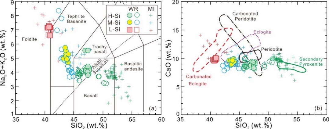 图1 山东新生代玄武岩全碱 (Na2O+K2O) 对SiO2 (a) 和CaO对SiO2 (b) 图解。WR: 全岩; MI: 橄榄石熔融包裹体。图 (b) 包含不同地幔岩石熔融产物的CaO和SiO2含量。