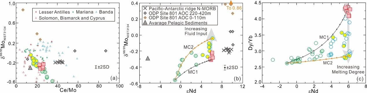 山东新生代玄武岩相对MORB明显更加富集Mo,兼有高于和低于MORB的d98/95Mo,类似于岛弧火山岩 (图3a)。Mo-B同位素与元素和放射成因同位素的协变关系揭示他们由三个端元组分组成 (图2和3):霞石岩、碧玄岩和碱性玄武岩端元。其中碧玄岩和霞石岩端元具有相似的Sr-Nd-Hf同位素组成,但是前者具有较高的SiO2、较低的微量元素含量和较弱的稀土分异程度,更低的Ce/Mo,更高的d98/95Mo和更低的d11B,这些数据揭示碧玄岩和霞石岩端元形成于流体助熔导致的不同程度地幔熔融,较多的流体导致高程度的部分熔融形成碧玄岩,反之形成霞石岩。霞石岩和碧玄岩端元熔体分别与浅部辉石岩熔体混合构成了山东霞石岩至碱性玄武岩序列。