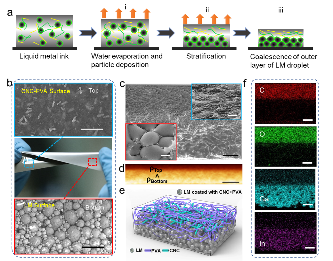 图1 液态金属纳米纤维素-聚乙烯醇复合的Janus柔性薄膜制备及其表征