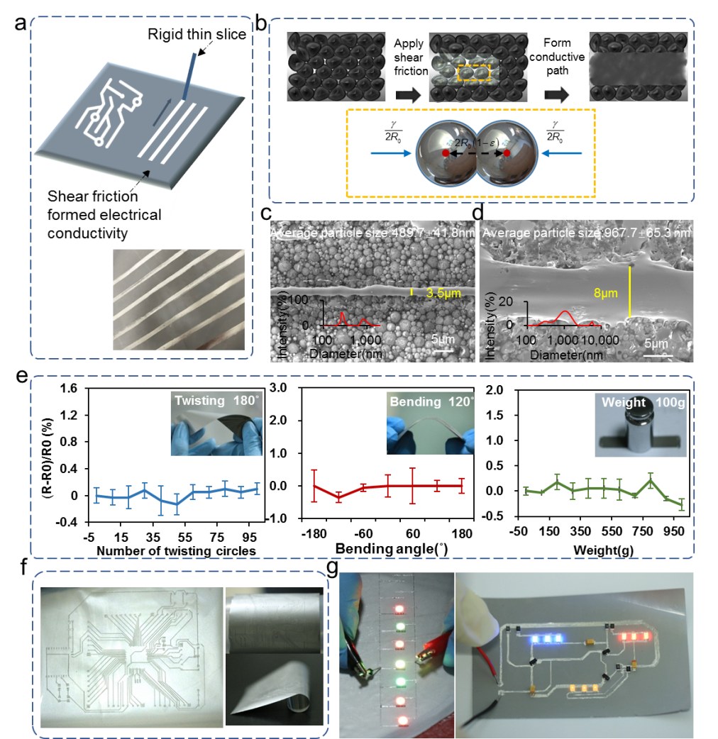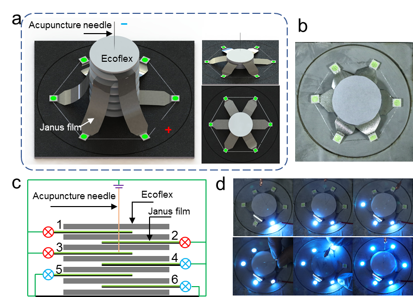 为了应对这一挑战,中国科学院理化技术研究所低温生物与医学研究团队利用自组装沉积法制备出了一种电学各向异性的柔性液态金属薄膜。利用纳米镓铟共晶合金(EGaIn)在纳米纤维素-聚乙烯醇溶液中的密度差和自然蒸发(图1),可成功制备1~49 μm的超薄Janus膜。这种膜在正常情况下,双面均不导电;而在垂直集中应力或者剪切摩擦力作用下,薄膜下层液态纳米EGaIn颗粒则可实现有效导通,从而传递电信号,值得一提的是,纳米液态金属导通响应时间只需2 ns(图2)。利用纳米EGaIn与纳米纤维素-聚乙烯醇复合物制备的深度传感器,不仅具有灵敏的深度探测能力,而且医生在训练过程中可以通过可视化显示灯在第一时间获取扎针的深度信息。这种液态金属薄膜作为一种全新的电子纸,为制造智能微尺度传感器的多层复杂电路提供了一个简便、快速的制造和响应平台(图3)。