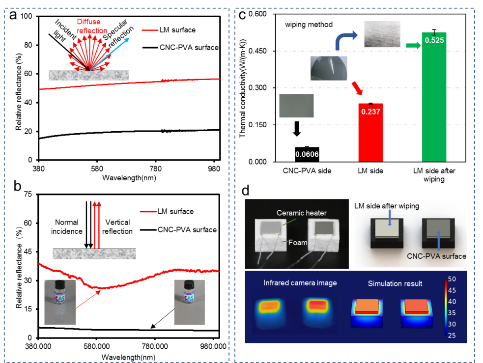 更进一步的,研究团队发现这种液态金属薄膜两面对光的反射效果以及导热性能也有显著性差异,这种特性使其有可能被用作光转化开关和温度调节器(图4)。这样一种同时具有电学、光学和热学三种特性的两面各异性薄膜,在制备的过程中不需要任何复杂的工艺及精密仪器的辅助,制备过程不仅简单易行,而且并不需要耗费太多时间。