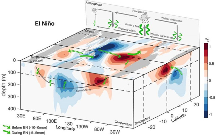 厄尔尼诺和南方涛动(ENSO)是气候系统中最主要的年际尺度变率。它虽然起源自热带太平洋,但对全球天气系统有极大的影响。厄尔尼诺伴随着大气、海表和地表升温(“发烧”),厄尔尼诺发生之后全球地表温度达到峰值。然而,平均深度约4000米的海洋到底是和大气或者海表一样“发烧”还是会“退烧”呢?