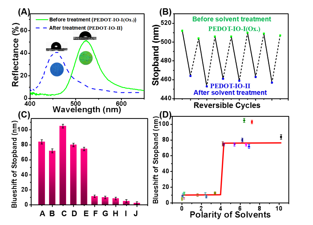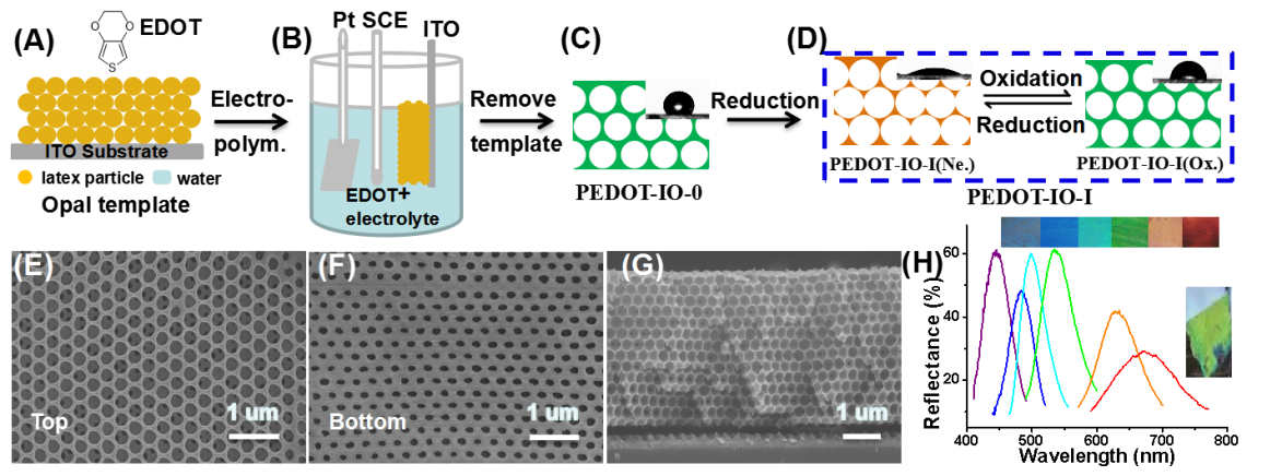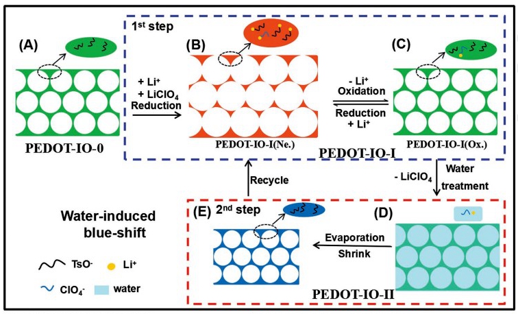 近期,中国科学院理化技术研究所仿生材料与界面科学重点实验室江雷团队研究员王京霞与兰州大学教授郭金山合作,在PEDOT光子晶体上实现了多彩图案的水写和电擦。他们通过电聚合制备聚3,4-乙烯二氧噻吩(PEDOT)光子晶体(PEDOT-IO-0)(图1),发现所制备PEDOT-IO具有四种状态和三种不同的开关形式(图2):第一个开关是从PEDOT-IO-0到PEDOT-IO-I(中性态)的不可逆的还原过程。第二个开关是PEDOT-IO-I(中性态)和PEDOT-IO-I(氧化态)之间的可逆电化学过程,伴随着由于离子掺杂/脱掺杂引起的可逆带隙(结构颜色)变化。第三个开关是水处理PEDOT-IO-I(氧化态)形成PEDOT-IO-II,由于水诱导LiClO4分子(Li +和ClO4-离子)的去除和周期性结构收缩,引起光晶带隙的蓝移(图3)。