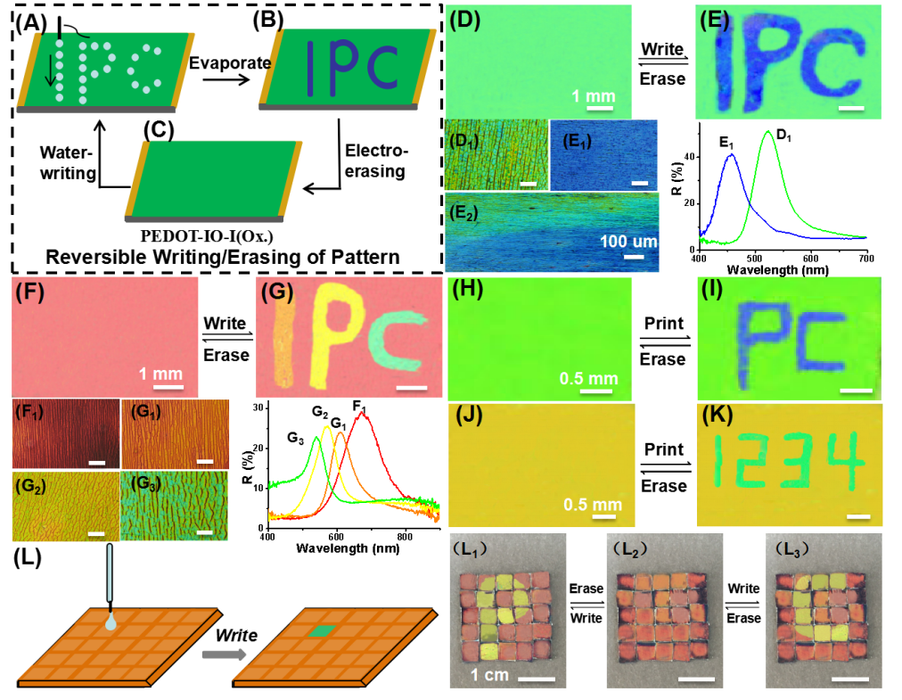 通过将PEDOT-IO-1(Ox)水诱导LiClO4分子去除效应与PEDOT-IO-I的电化学调制相结合,可以实现可逆的水写/电擦多色光晶图案(图4)。该研究工作为基于光子晶体的光学材料和器件的制备提供新的思路。