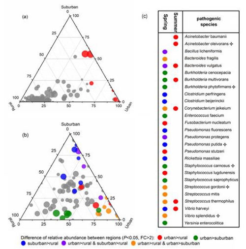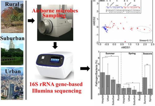 中国科学院城市环境研究所城市与健康重点实验室城市微生物组(苏建强研究组)为探究城镇化过程对空气微生物及潜在致病微生物的影响,对厦门市不同城镇化水平区域在不同季节(春季、夏季)进行空气微生物样品采集,采用高通量测序技术分析微生物群落组成,并通过数据比对分析潜在致病微生物分布情况,探讨城镇化过程对人群健康存在的潜在风险。研究结果表明:Firmicutes、Proteobacteria是空气微生物中占主导的微生物门类;夏季空气微生物多样性显著高于春季;空气微生物和潜在致病微生物组成在不同城镇化水平区域存在显著性差异;城镇化过程增加了潜在致病微生物相对丰度。
