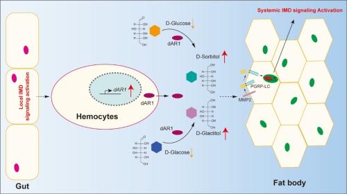 器官间的信号交流是非常古老的生物机制,从植物到高等动物广泛存在,几乎涉及所有的生物学信号通路。果蝇源于其强大的遗传操作优势,与人类高度保守的天然免疫信号通路和类似的器官系统,被潘磊研究组选为研究天然免疫时空应答的模式生物。该研究团队在之前的研究中(Nature Microbiology,2017),分别利用果蝇和小鼠肠道感染模型,揭示了维持肠道天然免疫信号稳态的关键因子。他们在后续的研究中发现,肠道的天然免疫信号通路(IMD通路,同源与人类NF-kB/TNF通路)的激活,不仅限制在肠道局部,而且足以造成远端中枢免疫器官脂肪体(fat body,类肝组织)所介导的系统性免疫应答。而且这种时空上的免疫信号延迟依赖于果蝇血细胞(plasmatocytes,类巨噬细胞)的存在。通过对比肠道感染前后果蝇血清中代谢组学的差异分析,该研究发现肠道感染所造成的局部天然免疫应答,可造成果蝇血液中多元醇代谢通路的激活,导致葡萄糖和半乳糖水平的下降,葡萄糖醇和半乳糖醇的上升。这些上调的糖醇物质可以在体外和体内激活脂肪体介导的系统免疫应答。通过同源序列检索,研究发现果蝇中介导多元醇反应的人类同源基因(命名为dAR1),且只有血细胞中的dAR1可以特异性地应答于肠道天然免疫活化,并介导“肠-肝”轴的免疫信号传递。进一步的机制研究发现,血液中上调的糖醇物质可以上调脂肪体上的金属蛋白酶(Mmp2),然后通过切割天然免疫通路膜上受体PGRP-LC,最终激活脂肪体介导的系统性免疫应答。