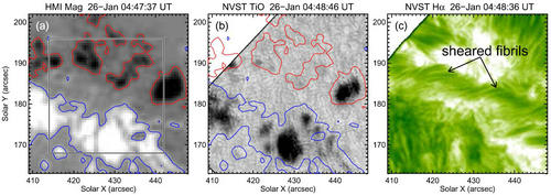 图1:耀斑发生前的光球磁场以及低层大气成像(从左到右依次是:SDO/HMI光球磁图,NVST/TiO光球图像,NVST/Hα色球图像)