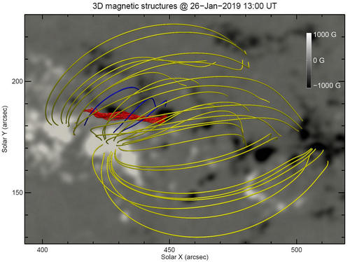 图2:计算所得日冕三维磁结构俯视图(红色:磁绳;蓝色:磁绳上方小尺度磁环;金色:活动区大尺度磁环)