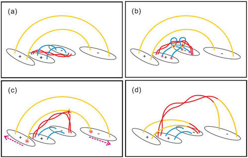 图3:磁绳两阶段演化导致约束耀斑示意图(a-b:标准上升;c-d:外部重联)