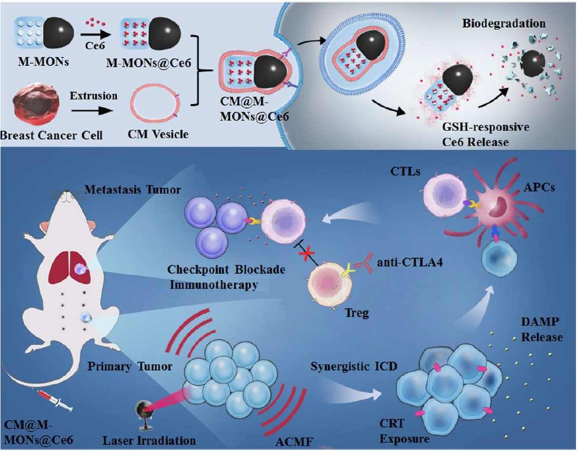 图2 制备细胞包裹的仿生可降解Janus型磁介孔二氧化硅纳米载药系统用于乳腺癌的光动力磁热协同治疗联合免疫检查点阻断治疗