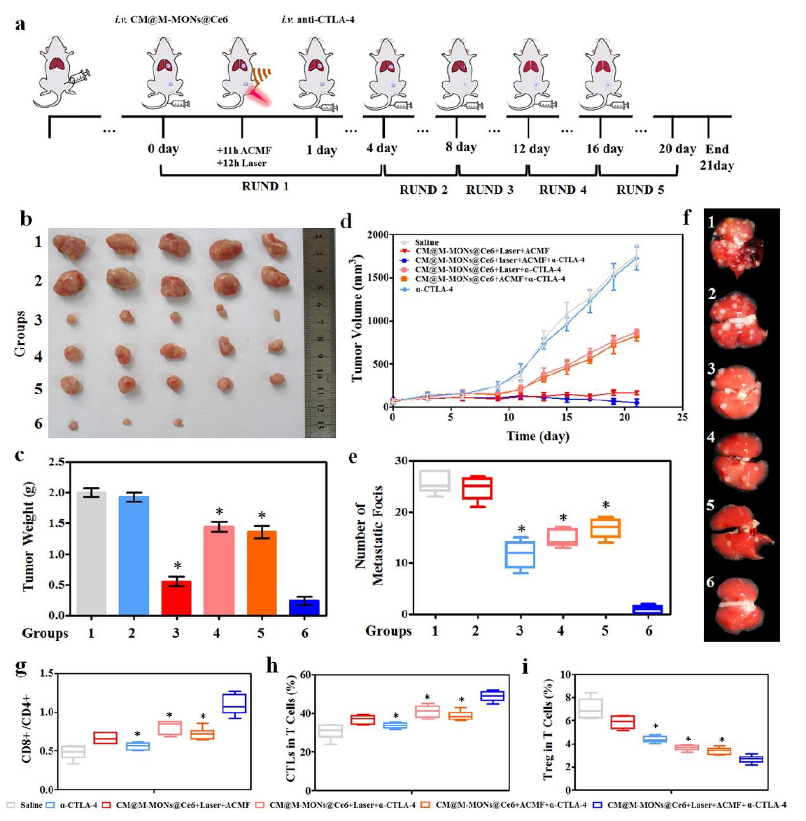 图3 Janus纳米载药系统的肿瘤治疗效果。(a)给药时间,(b)肿瘤照片,(c)肿瘤重量,(d)肿瘤生长曲线,(e) 肺转移肿瘤的个数(f)照片。在联合光动力治疗、磁热治疗和免疫检查点阻断治疗9天后,收集血清和原发肿瘤组织,分析(g)转移瘤组织中CD8+T细胞/CD4+T细胞比值、(h) CTL含量和 (i) Treg含量。