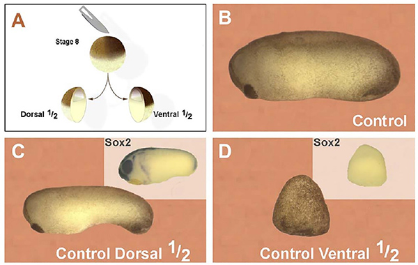 图1. 爪蟾胚胎一切为二,背部一半可发育为个头较小但有正常背腹体轴的胚胎(引自Bruno Reversade et al., 2005)