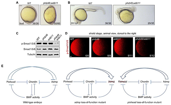 研究发现pinhead基因在原肠期特异地表达在斑马鱼胚胎腹部和侧面的边缘区域。过表达pinhead可以使胚胎背部组织减少,腹部组织增多,呈腹部化表型。进一步的研究表明,Pinhead是一种可分泌蛋白,能够特异激活BMP信号下游的Smad1/5/8,是一种尚未被鉴定的BMP配体。有意思的是,Pinhead和表达于胚胎背部的Admp具有高度相似的蛋白性质,除了具有BMP蛋白配体活性,还可以促进金属蛋白酶介导的Chordin的降解。