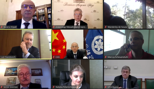 12月14日,第三届金砖五国(BRICS)科学院线上会议开幕。本次会议主题为“在抗击新冠疫情战役中的科学院-后疫情时代中的经济、社会发展趋势”。中国科学院副院长张亚平、俄罗斯科学院院长Alexander Sergeev、巴西科学院院长Luiz Davidovich、南非科学院院长Jonathan Jansen、印度科学院副院长Jitendra P. Khurana等以视频连线形式出席会议并致辞。
