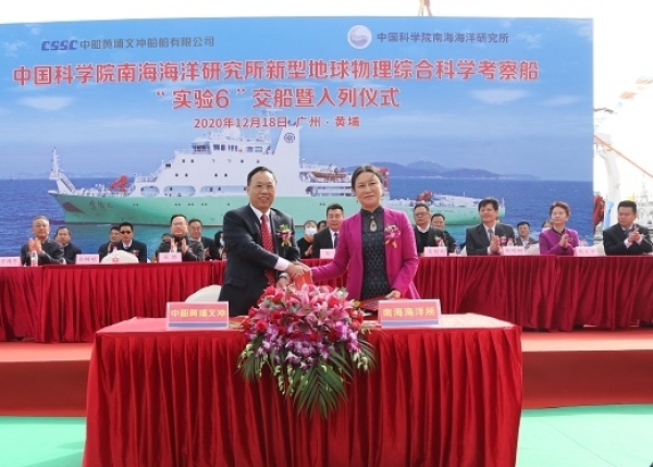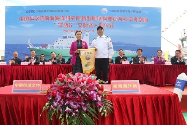 在各位来宾的见证下,南海海洋所副所长(法定代表人)龙丽娟和中国船舶集团旗下黄埔文冲公司党委书记、董事长向辉明分别代表南海海洋所、黄埔文冲签署了“实验6”新型地球物理综合科学考察船交船文件。随后,龙丽娟宣布“实验6”正式入列,并向船长授旗。