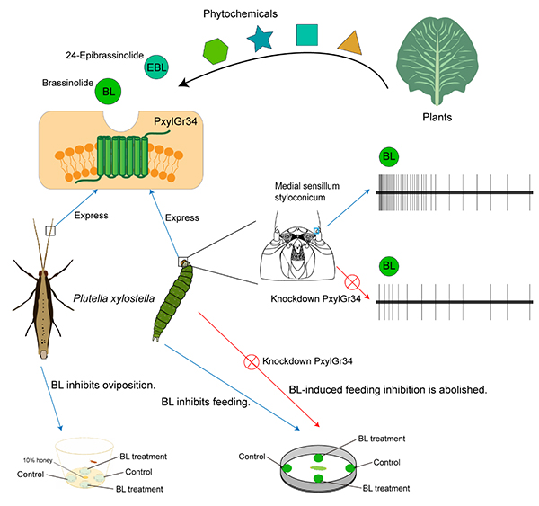 小菜蛾(Plutella xylostella)是一种世界性的大害虫,专门危害十字花科蔬菜。为揭开小菜蛾专食十字花科植物之谜,王琛柱团队把研究重点放在对小菜蛾苦味受体的功能分析上。研究发现,在小菜蛾的GR基因中,有一个苦味受体基因——PxylGr34,其在小菜蛾四龄幼虫的头部及成虫的触角中高表达,由此,研究人员猜测这个基因可能具有重要的味觉感受功能。通过爪蛙卵母细胞表达和双电极电压钳记录实验,发现表达该基因的细胞对植物激素油菜素内酯及其类似物24-表油菜素内酯的刺激较敏感;以这两种植物激素刺激幼虫口器上的味觉感器,确认二者均可诱发口器下颚叶上中栓锥感器的电生理反应。为了明确油菜素内酯对小菜蛾的行为影响,研究人员进一步设计了一系列的昆虫取食选择和产卵选择实验:在植物叶片上涂抹油菜素内酯后,小菜蛾幼虫的取食面积明显减小;在产卵介质上涂抹油菜素内酯后,小菜蛾成虫在其上的产卵量也显著变少,这表明油菜素内酯对小菜蛾幼虫的取食及成虫的产卵均有抑制作用。研究人员利用RNA干扰的方法,降低该受体基因在幼虫的表达后,发现幼虫口器下颚叶上中栓锥感器的电生理反应明显降低,油菜素内酯对幼虫无显著的取食抑制作用,这证实PxylGr34的表达介导了小菜蛾对油菜素内酯的厌恶行为反应。