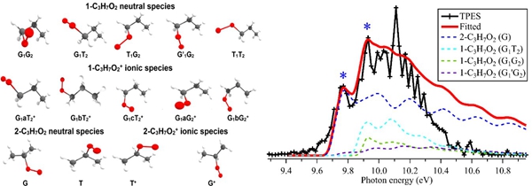 研究人员通过扫描同步辐射光子能量,测量获得具有质量选择的超高分辨光电子谱,结合高精度的量子化学理论计算,准确辨认出丙基过氧自由基的1-C3H7O2和2-C3H7O2同分异构体,以及它们的G、G1T2、G1G2和G1’G2等旋转构象体,为深入研究大气过氧自由基化学反应提供了重要数据和检测方法。