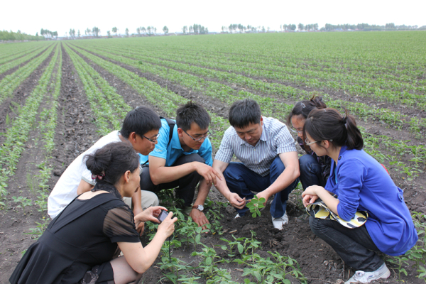 韩晓增(左四)和学生们在查看大豆生长情况。受访者提供。