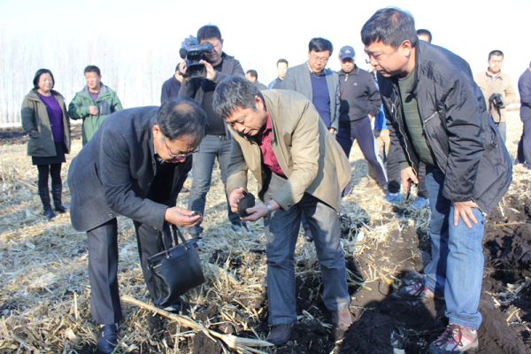 韩晓增(中)介绍黑土地保护利用后土壤结构。受访者提供
