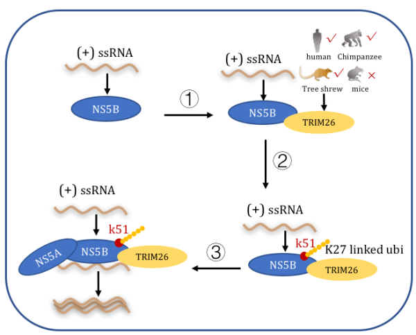 该研究中,研究人员通过全基因组CRISPR/Cas9筛选,首次发现E3泛素化连接酶TRIM26是HCV重要的宿主因子。实验结果显示,TRIM26特异性地促进了HCV基因组的复制,而对于同属黄病毒科的其他病毒(如登革病毒和寨卡病毒)的复制没有作用。机制研究发现,TRIM26与病毒编码的RNA依赖性RNA复制酶NS5B相互作用,催化NS5B蛋白的第51位赖氨酸发生K27连接的泛素化修饰,从而增强NS5B与病毒复制复合体中另外一个关键蛋白NS5A的结合,最终促进HCV基因组的复制。此外,该研究还比较了不同宿主来源的TRIM26对HCV复制的影响,发现人以及树鼩来源的TRIM26可支持病毒的复制,但小鼠来源的TRIM26不能支持HCV复制。序列分析发现,与其他种属相比,鼠源TRIM26存在一段6个氨基酸的插入,删除掉该氨基酸插入序列的鼠源TRIM26可部分恢复其与病毒NS5B的相互作用及帮助病毒基因组复制的功能。该研究还发现,在小鼠肝细胞中表达人源TRIM26可显著增强HCV的感染效率。该研究发现了HCV新的宿主因子,进一步解析了HCV复制的分子机制;为HCV小动物感染模型的建立提供了新思路,具有重要意义。