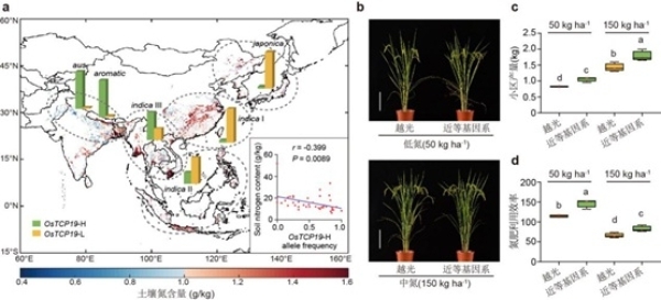 中国科学院遗传与发育生物学研究所储成才研究组对过去100年间收集于全球不同地理区域52个国家(地区)的110份早期水稻农家种进行了全面的农艺性状鉴定,发现不同氮肥条件下,在众多农艺性状中,水稻分蘖(分枝)氮响应能力与氮肥利用效率变异间存在高度关联。研究组利用全基因组关联分析技术鉴定到一个水稻氮高效基因OsTCP19,其作为转录因子调控水稻分蘖。