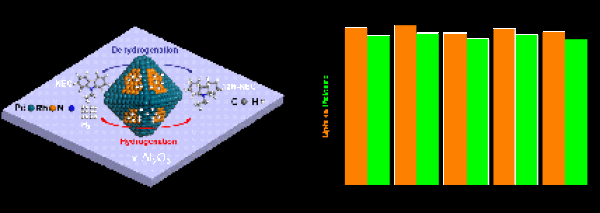 近年来,有机液体载体(LOHC)储氢技术具有储氢容量大、应用安全、高效环保、可实现远距离储存和运输等优点,得到广泛关注。然而,开发一种高效可重复使用的单一催化剂以连续吸收和释放LOHC中的氢,仍是挑战。中国科学院上海高等研究院低碳转化科学与工程重点实验室研究员孙予罕、陈新庆团队报道了一种新型的高效可重复使用的双金属Pd-Rh纳米粒子(NPs)多孔材料催化剂(如图1),利用其双金属纳米粒子的协同效应,有效促进了N-乙基咔唑(NEC)的加氢和十二氢-乙基咔唑(12H-NEC)的脱氢,可逆地进行了多次高储氢量的加氢和脱氢的循环。同时,多种原位表征证明其优异的活性归因于多孔材料载体表面的双金属Pd-Rh 纳米团簇结构。