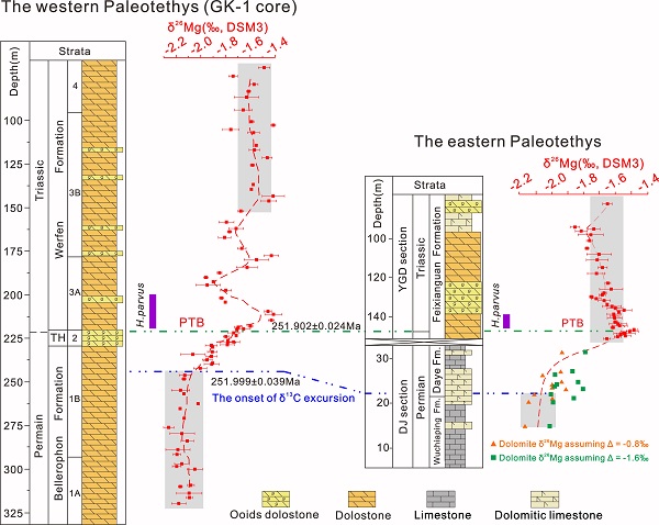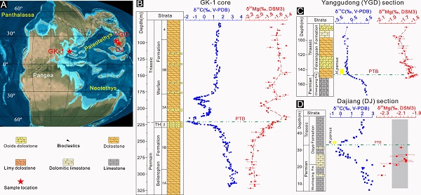 在古生代和中生代转折期,地球上发生了显生宙规模最大的一次生物大灭绝事件——二叠纪末生物大灭绝事件。在6万年的时间里,约81%的海洋生物彻底消失,破坏了存在了2亿年的海洋生态系统。该时期,古海洋环境发生了包括海水升温、酸化、缺氧或硫化、大规模海退以及洋流循环受阻等一系列变化,这些变化均是导致二叠纪末海洋生物大灭绝的可能因素;这些因素彼此之间又具有一定的内在关联性。与其他常用来探讨古环境背景的铀、硫、铁等元素相比,镁在海洋中具有更高的含量;海洋中镁元素循环常与碳-氧循环过程相伴,因而,其与一系列重大海陆变迁及生命过程相关。
