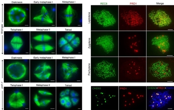 中国科学院遗传与发育生物学研究所研究员程祝宽团队通过图位克隆方法,鉴定出了水稻中的PRD1基因,其编码一个保守的减数分裂蛋白,介导了减数分裂特异DSB的形成。有趣的是,在prd1突变体中,花粉母细胞纺锤体组装异常,多极纺锤体不能转变为正常的两极纺锤体。免疫荧光实验表明,PRD1蛋白在染色体上呈现动态变化的定位模式。在减数分裂起始的细线期定位在整条染色体上,而后逐渐富集在每条染色体的着丝粒区域。PRD1能够与动粒蛋白组分存在相互作用,暗示其可能在动粒复合体组装过程中发挥重要功能。此外,PRD1与REC8和SGO1发生相互作用,从而参与减数分裂纺锤体的组装。相关结果为染色体介导的植物减数分裂纺锤体组装理论提供了直接证据。