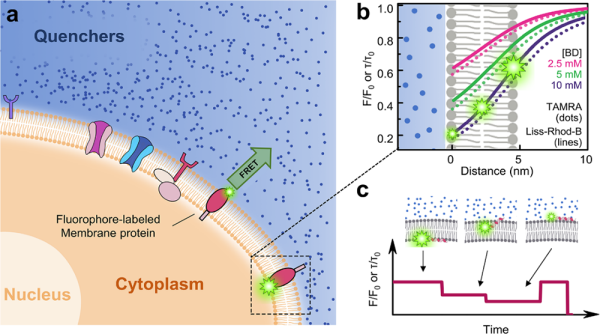 近日,中国科学院物理研究所/北京凝聚态物理国家研究中心软物质物理实验室博士生侯文清、博士后马东飞和贺小龙等在副研究员陆颖和研究员李明的指导下,以前序发展的高精度物理测量方法为基础,发展了专门针对活细胞膜界面膜蛋白动力学测量的高精度方法,进而对其机理进行深入研究。该方法命名为细胞外环境填充荧光受体的荧光共振能量转移(FRET with quenchers in extracellular environment,简称queenFRET)。该方法应用单点对多点的荧光分子间共振能量转移(FRET)原理,通过测量荧光标记分子的荧光强度或荧光寿命,可精确观察标记位点的插膜深度随时间的变化。该方法以好于1纳米(约等于细胞膜总厚度的十分之一)的精度探测细胞膜上单个膜蛋白的动力学。这是迄今为止检测活细胞膜单个蛋白沿膜法线方向运动的最高精度。应用这一方法,可解决以往蛋白质与膜相互作用研究中的问题,包括膜蛋白的跨膜动力学、膜蛋白拓扑结构的动态转变及细胞信号感知与响应等。
