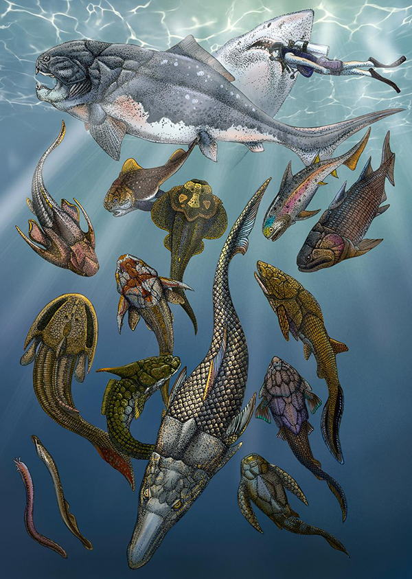 图3 “鸭嘴兽古鱼”Brindabellaspis(前景中央)和其他史前鱼类复原图(杨洪宇、郑秋旸绘)。画面右上方的大白鲨和人类潜水员为现代有颌脊椎动物的代表