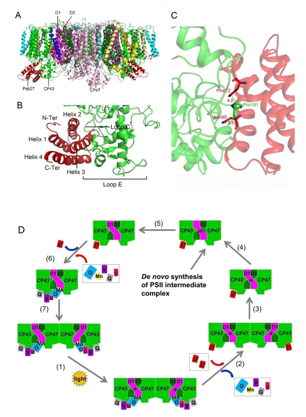 嗜热蓝藻(Thermosynechococcus vulcanus)PSⅡ组装修复中间复合体Psb27-PSⅡ结构及PSII组装修复模型:(A)Psb27-PSⅡ整体结构图;(B)Psb27在复合体中的结合位点;(C)Psb27与CP43的相互作用;(D)PSII组装修复模型