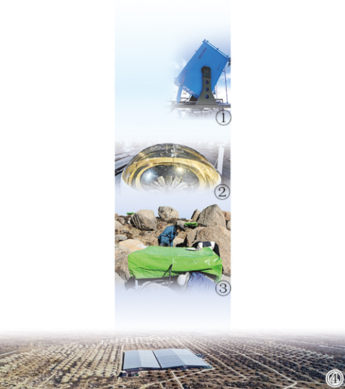 图①:雪后的广角切伦科夫望远镜。图②:水切伦科夫探测器内部的光电倍增管阵列。图③:科研人员正在验收电磁粒子探测器。图④:宇宙线观测站拉索全景。中科院高能所供图