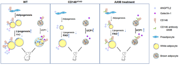通过与卜鹏程团队的合作,利用高脂饮食诱导肥胖、年龄相关肥胖及瘦素受体缺失引起肥胖的小鼠模型,发现肥胖小鼠脂肪组织中的CD146表达水平上调,这一现象在对大量临床组织的研究中得到验证。进一步研究表明,全身敲除CD146或脂肪细胞上特异性敲除CD146均可抑制高脂饮食诱导的肥胖、脂肪肝、胰岛素耐受及慢性炎症等并发症,证实了CD146在肥胖发生中发挥重要作用。机制研究发现,CD146在脂肪前体细胞和成熟脂肪细胞中发挥不同的功能。在脂肪前体细胞中,CD146分子是脂肪细胞因子ANGPTL2(Angiopoietin-like protein 2)的受体,二者的相互作用通过激活CREB蛋白,促进白色脂肪细胞的分化;在成熟白色脂肪细胞中,二者互作调控炎症因子的分泌、促进脂质合成并抑制脂肪酸氧化,从而促进肥胖的发生。在棕色脂肪中,CD146与ANGPTL2结合并不影响棕色脂肪的产热功能,但CD146与配体Galectin1结合会抑制解偶联蛋白UCP1的表达,从而抑制能量消耗。在此基础上,合作团队探索了以CD146为靶点进行肥胖治疗的策略。结果表明,脂肪细胞敲除CD146不仅有效抑制肥胖及其并发症的发生,而且促进棕色脂肪细胞的耗能产热功能;CD146的单克隆抗体AA98则能够通过抑制CD146与其配体的结合抑制肥胖及其并发症的发生,表明该分子有可能成为肥胖治疗的靶点。