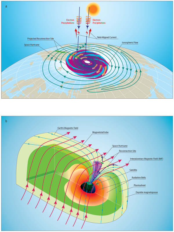 科研人员发现 “太空台风”源于太阳风-磁层耦合作用。在长时间极端地磁平静和行星际磁场北向,在地球磁层的高纬尾瓣处持续发生的尾瓣磁重联过程,促使在北极磁极点上方的磁层与电离层之间形成一个巨大的顺时针旋转的漏斗形磁螺旋结构。该结构形成了太阳风带电粒子直接进入地球中高层大气、地球带电粒子逃逸至磁层的通道,极大提升了太阳风-磁层能量的耦合效率。这说明即使在极端平静地磁条件下,极区仍可能存在堪比超级磁暴活动时的局地剧烈地磁扰动和能量注入现象,更新了人们对太阳风-磁层-电离层耦合过程的认识。