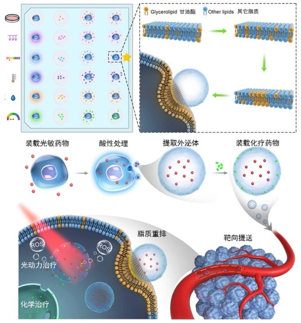 受到肿瘤组织特殊微环境的启发,生化工程国家重点实验室生物剂型与生物材料团队研究员马光辉、魏炜,与上海交通大学医学院附属同仁医院主任医师王玉刚合作,提出采用和肿瘤组织环境相似的外界条件(酸性、H2O2、乏氧等)驯化肿瘤细胞,发现酸性环境会促使肿瘤细胞分泌更多外泌体,且可以提高这些外泌体被同源肿瘤细胞摄取的性能。通过脂质组学和分子动力学模拟发现,驯化过程会增加外泌体细胞膜成分中甘油脂的比例,进而通过其自聚集重排特性增强与同源肿瘤细胞的相互作用,提高同源靶向能力。利用上述重编程后的外泌体联合装载光敏和化疗药物,通过近红外激光照射活化外泌体中的光敏药物,使其产生大量活性氧进而破坏外泌体的结构并释放化疗药物,以此实现在肿瘤组织的响应释放和联合治疗。