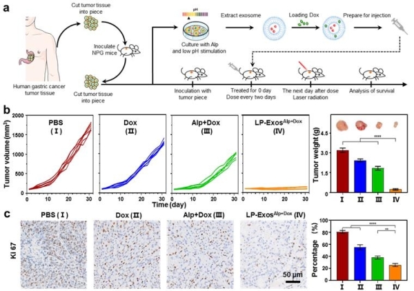 图2.基于重编程的肿瘤外泌体剂型在胃癌患者来源的异种移植瘤模型上的疗效评价:(a)模型的构建及治疗策略;(b)小鼠肿瘤生长曲线及最终瘤重;(c)肿瘤组织免疫组化分析