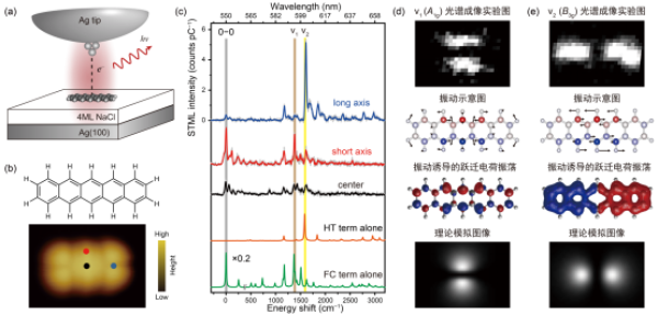 (a)STM诱导单个分子电致发光的实验示意图;(b)并五苯结构示意图和STM形貌图;(c)分子位置依赖的电致发光点谱;(d)FC贡献主导的v1电子-振动峰对应的光谱成像实验图及其相关理论模拟;(e)HT贡献主导的v2电子-振动峰对应的光谱成像实验图及其相关理论模拟