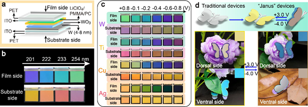 为了更好、更有趣地展示这种新型“双面神”多彩电致变色技术,科研人员受自然界枯叶蝶的启发(其背侧与腹侧颜色不对称),制作出一个人工枯叶蝶器件来展示这种独特的“双面神”特性(图d)。这只人工蝴蝶的背侧和腹侧翅膀表面呈现出不同颜色,当它合上翅膀时,腹侧表现出暗淡的棕褐色,像一片干燥的叶子,可以帮助躲避捕食者;当它张开翅膀时,可以呈现出绚丽的颜色且可实现色彩转变。